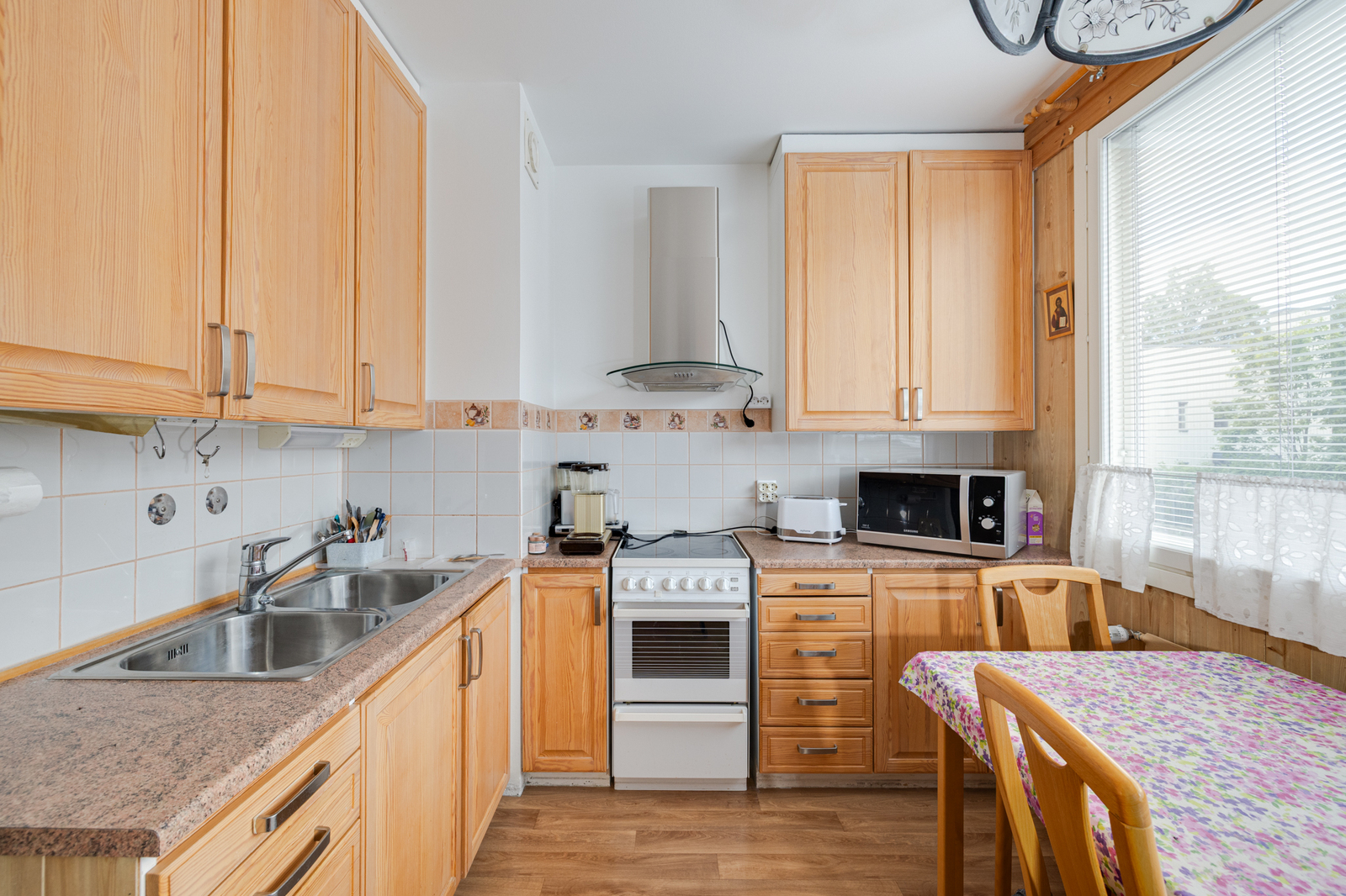 Keittiö: | Varustus: jääkaappi/pakastin, liesituuletin / suodatin. Työtasot: laminaatti. Liesi: keraaminen. Lattia: muovi. Seinät: lasikuitutapetti |