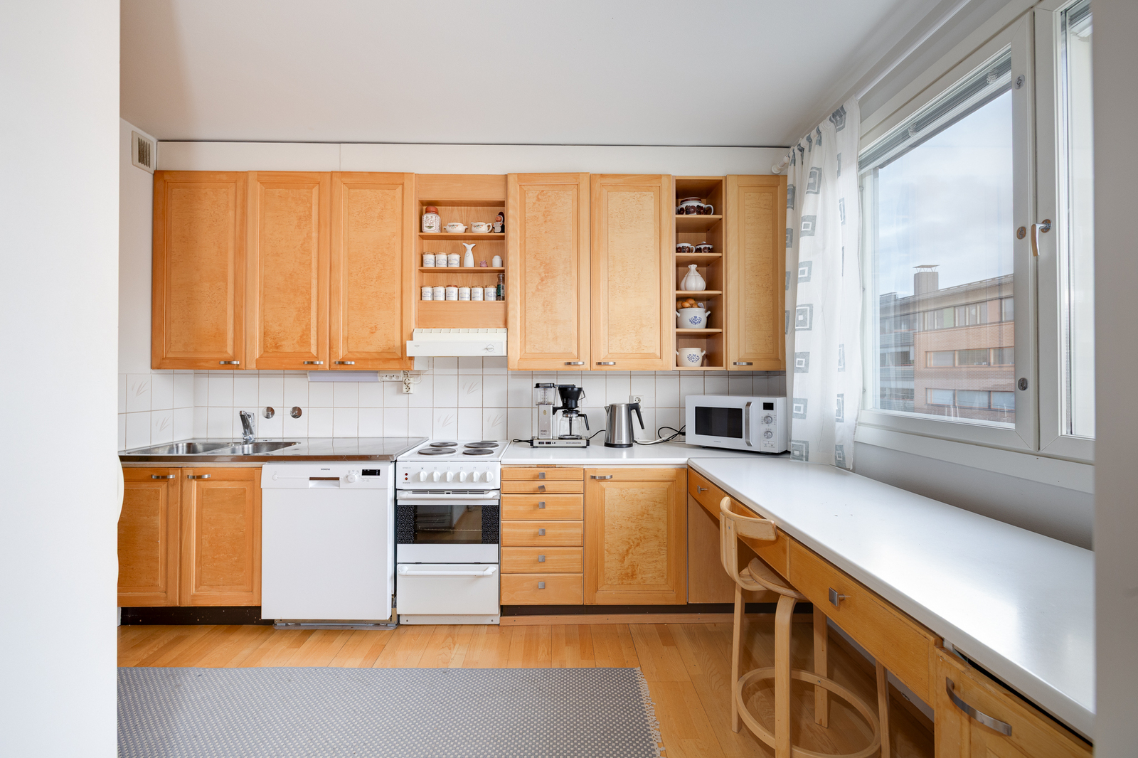 | Keittiö: | Varustus: jääkaappi/pakastin, liesituuletin, mikroaaltouuni, astianpesukone. Työtasot: laminaatti. Liesi: sähköliesi. Lattia: parketti. Seinät: maalattu |