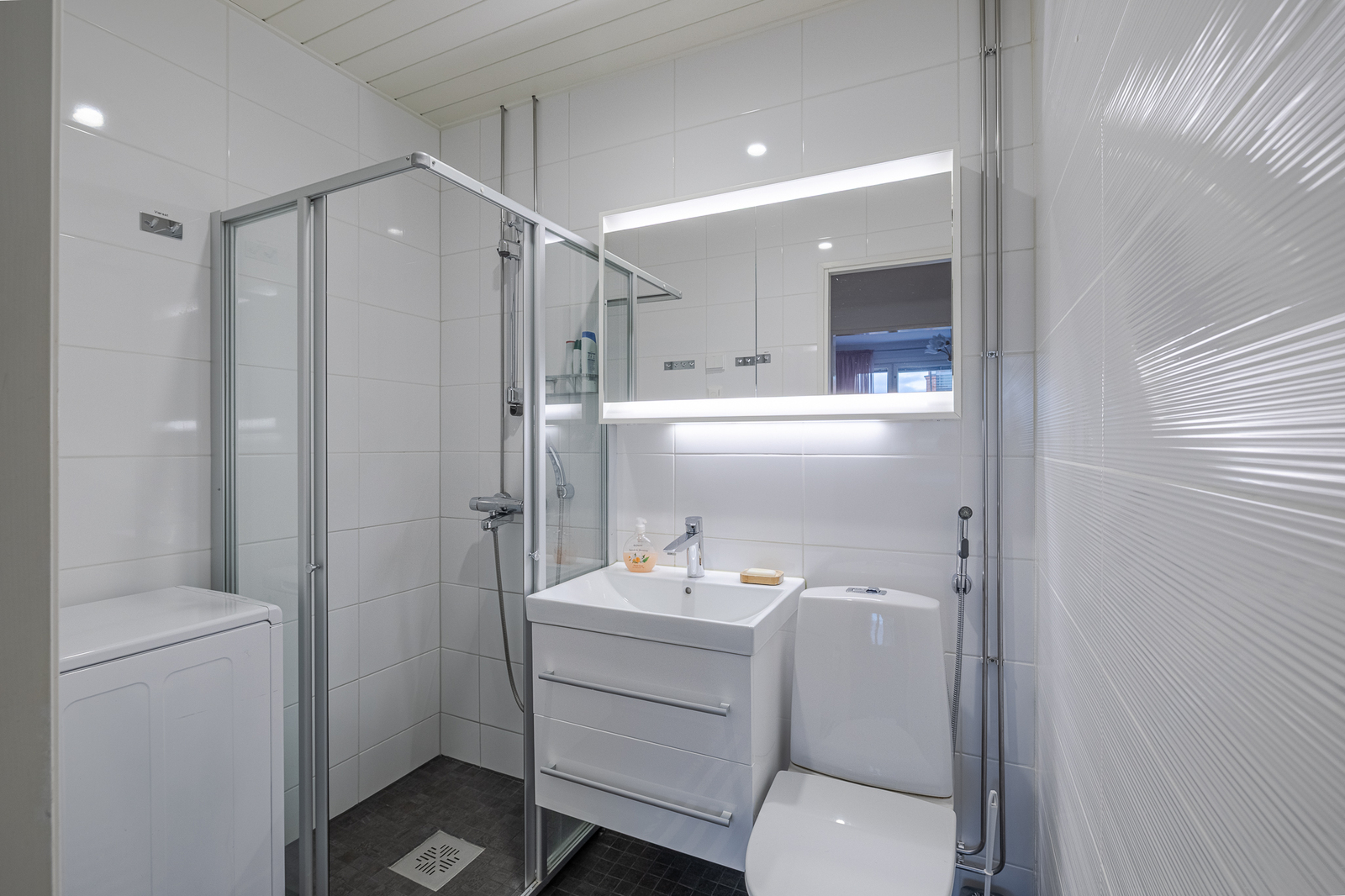 | Pesutilat: | Kylpyhuone remontoitu käyttövesiputkiremontin yhteydessä 2015-2016. Varustus: suihkuseinä, pesukoneliitäntä, lattialämmitys, wc-istuin, suihku, peilikaappi, kylpyhuonekaapisto Seinät: kaakeli Lattia: laatta |