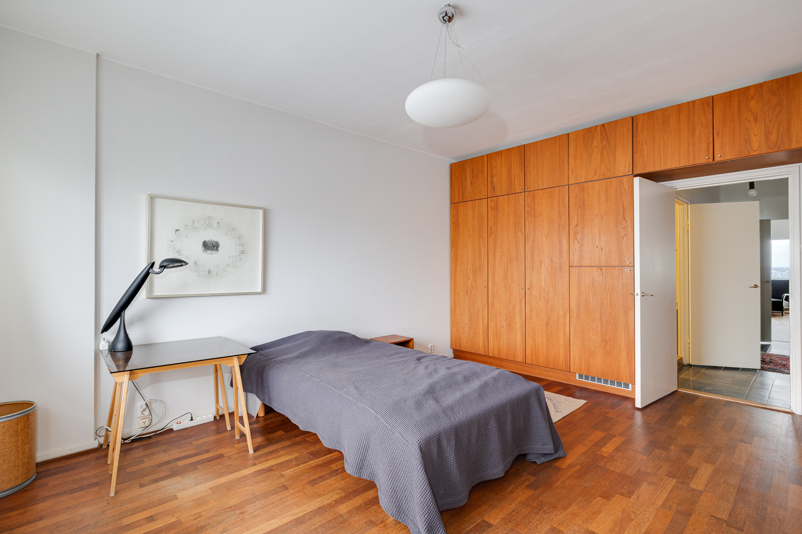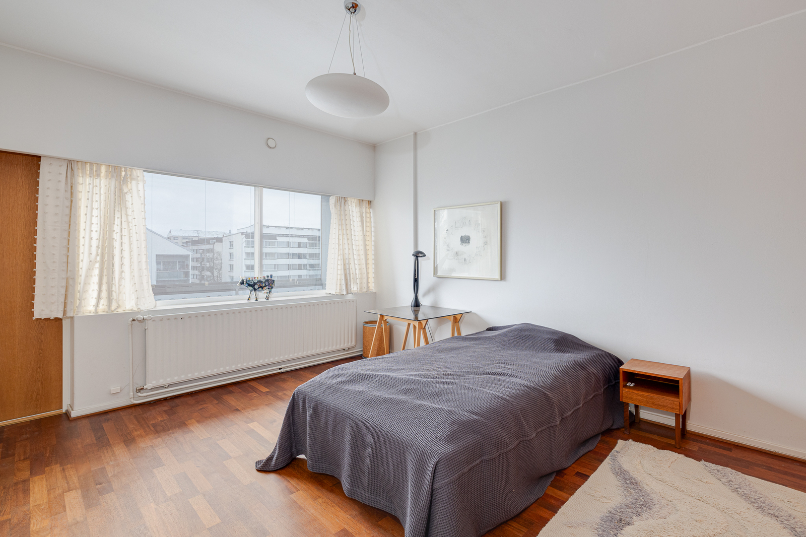 Makuuhuoneet: Makuuhuoneen yhteydessä toinen lasitettu parveke. Koko seinän kaapistoa (tehty mittatilaustyönä puusepällä teakistä). Seinät: maalattu Lattia: parketti