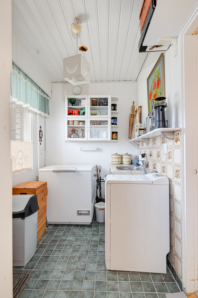 | Kodinhoitohuone: | Varustus: pesukoneliitäntä, pesuallas, lattialämmitys, lattiakaivo, pyykkikaapit. Lattia: laatta |