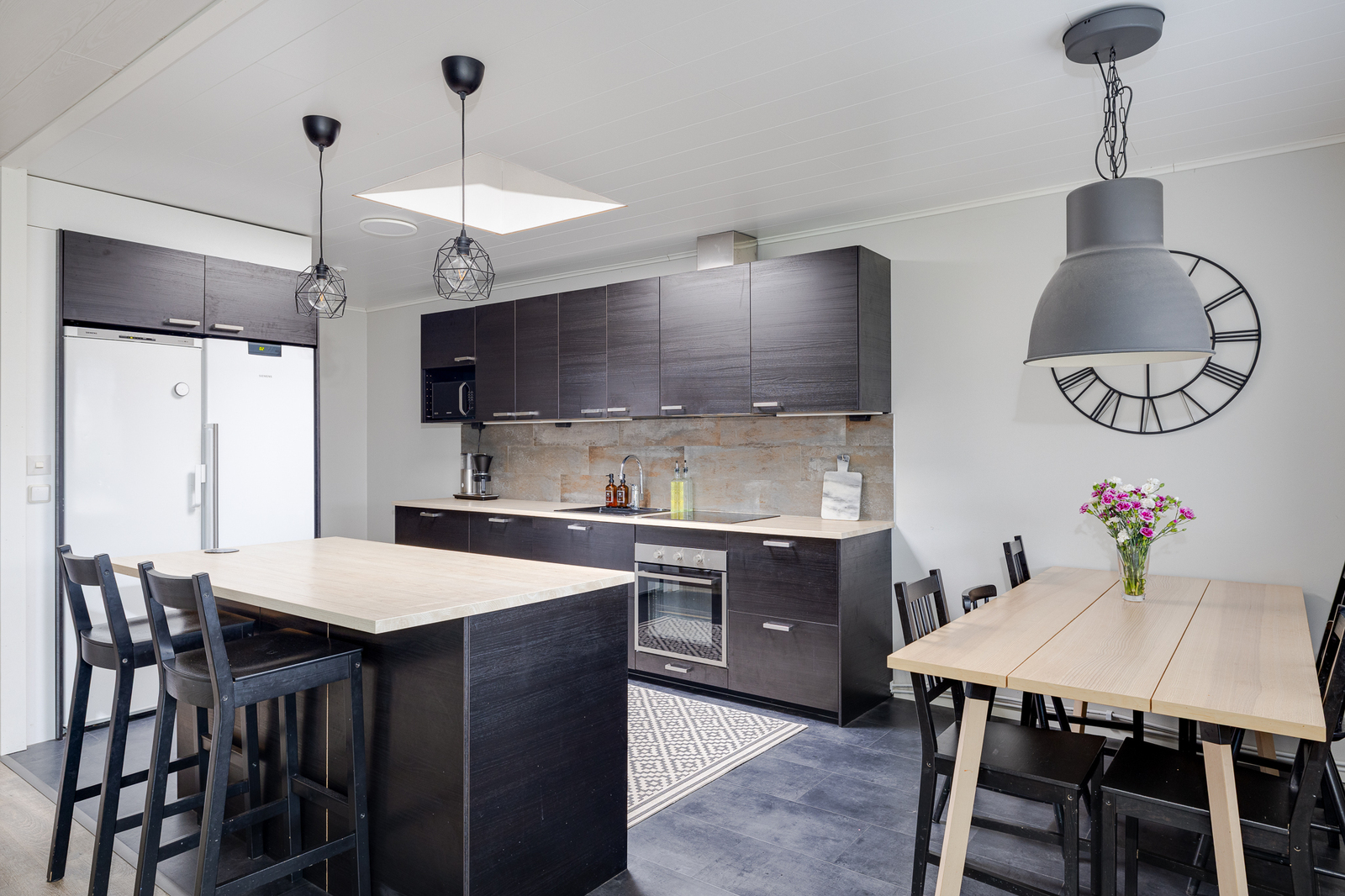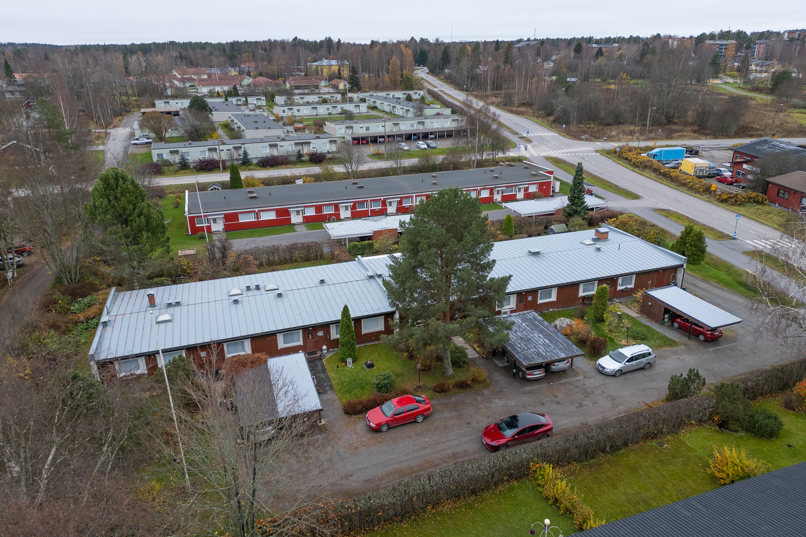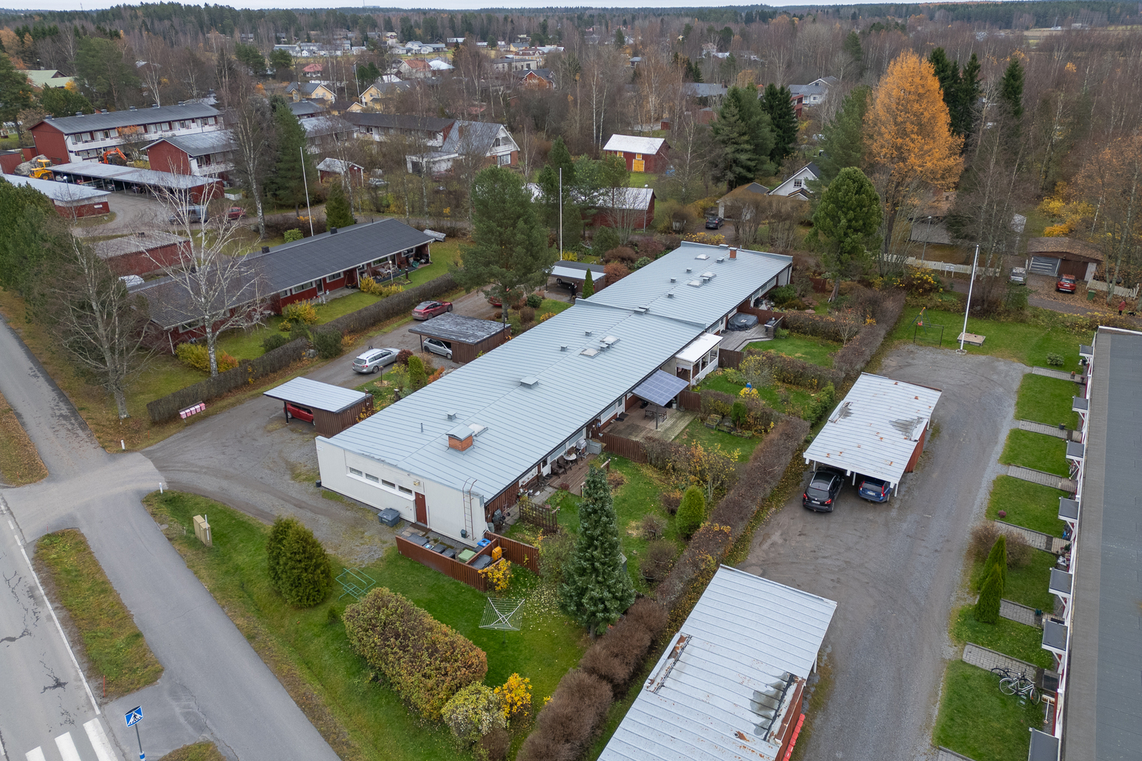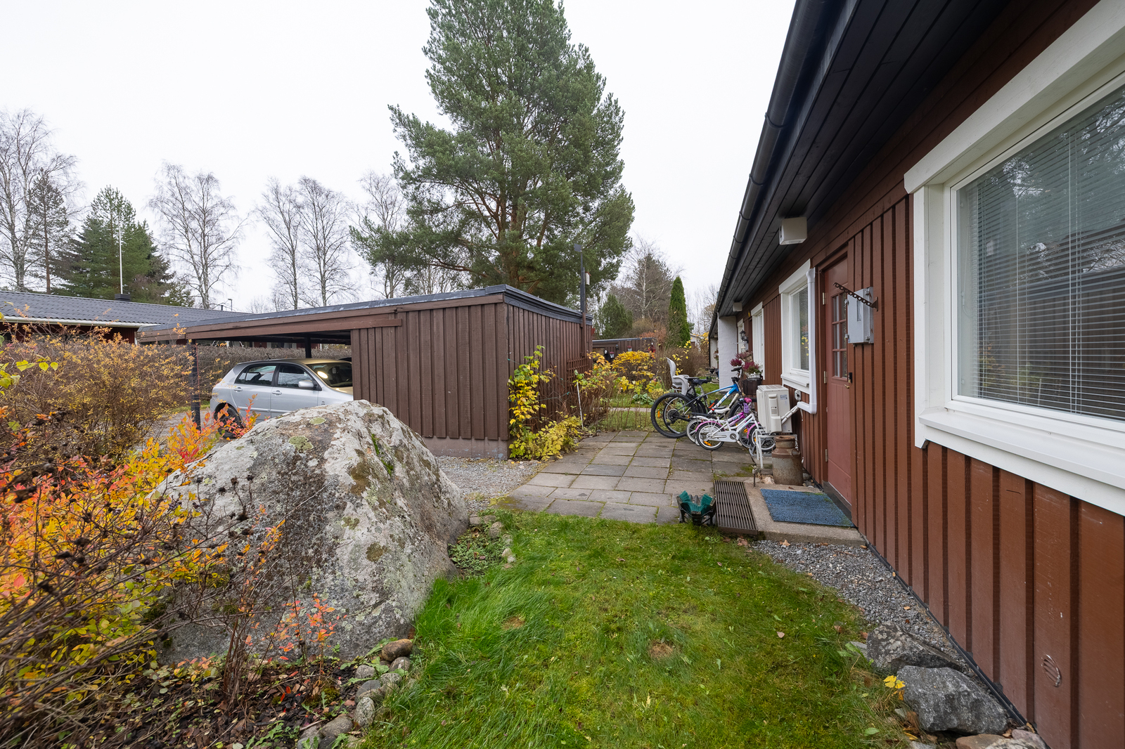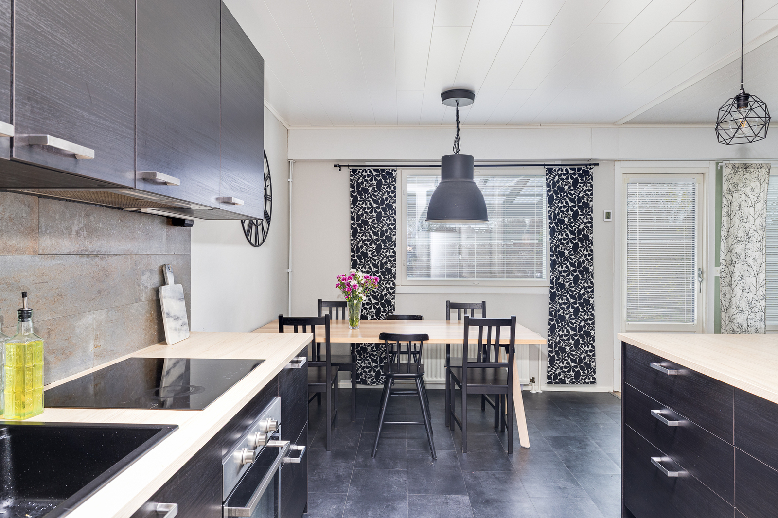 Tyylikkäästi ja modernisti remontoitu, tilava 88 m²:n saunallinen rivitalokolmio Sepänkylässä, hyvin hoidetussa kaukolämpöyhtiössä. Kaikki asuintilat ovat kätevästi yhdessä tasossa. Kesäisin asuminen laajenee ulos isolle, osittain katetulle terassille. Omaa piha-aluetta ympäröi todella tiheä pensasaita, mikä helpottaa vaikkapa koiranomistajan elämää. Asunto on kauttaaltaan erinomaisessa kunnossa. Keittiö on uusittu vuonna 2019, jolloin myös keittiön ja olohuoneen välinen seinä on avattu yhtenäiseksi oleskelutilaksi. Samalla on päivitetty pintamateriaalit ja remontoitu kylpyhuone; erillinen wc on uusittu vuonna 2018. Taloyhtiössä on tehty merkittäviä kunnostuksia: ikkunat, ovet ja käyttövesiputket on uusittu, ja yhtiö sijaitsee omalla tontilla. Autopaikka löytyy aivan oman sisäänkäynnin vierestä katoksen alta – arjen mukavuutta parhaimmillaan. ************************************ Elegant och modernt renoverad radhustrea på 88 m² med bastu, belägen i Smedsby i ett välskött bolag med fjärrvärme. Bostaden ligger bekvämt i ett plan. På somrarna utvidgas boendet till den stora, delvis täckta terrassen. Den egna gården är inhägnad med en tät häcke, som är praktiskt t.ex. om man råkar ha en hund. Lägenheten är i utmärkt skick. Köket renoverades 2019 och väggen mellan kök och vardagsrum togs bort för att skapa en ljus och öppen sällskapsyta. Samtidigt förnyades ytorna och badrummet renoverades delvis; den separata toaletten uppdaterades 2018. Bostadsbolaget har genomfört flera större förbättringar – alla fönster, dörrar och vattenledningar har bytts ut, och fastigheten står på egen tomt. Bilplatsen finns bekvämt under taket alldeles intill den egna ingången – en detalj som gör vardagen både enklare och bekvämare.