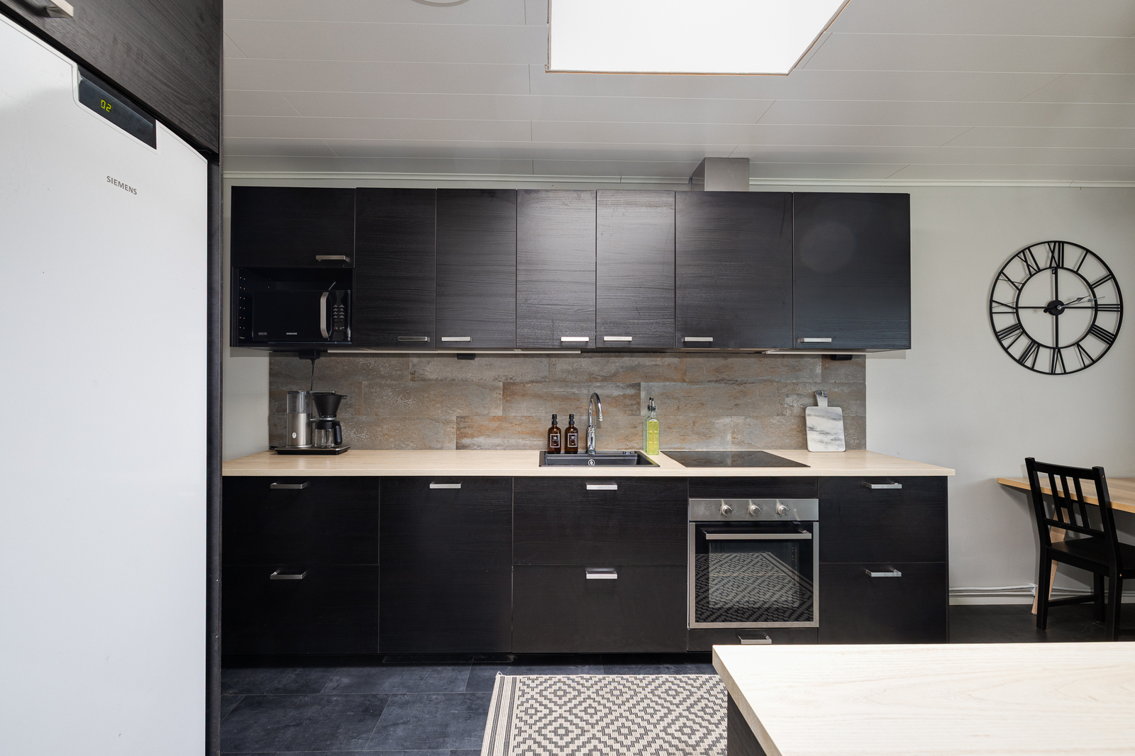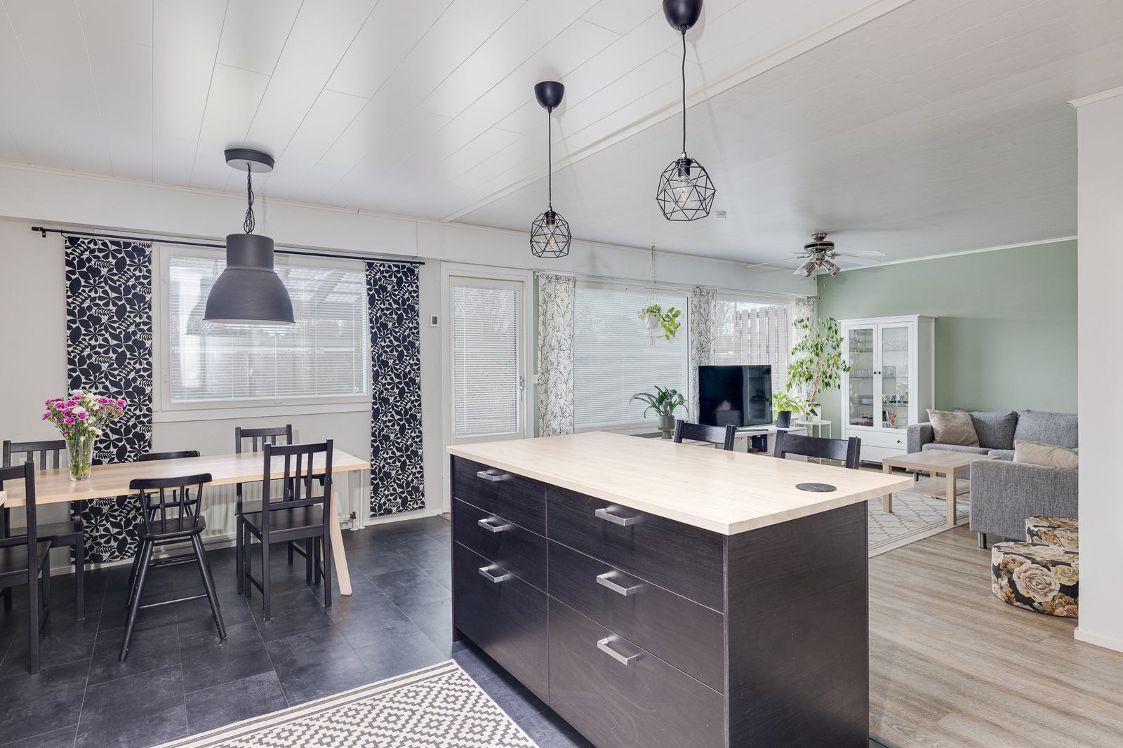 | Keittiö: | Remontoitu 2019, poistettu seinä keittiön ja olohuoneen väliltä ja asennettu saareke väliin. Varustus: jääkaappi, liesituuletin, astianpesukone. Työtasot: laminaatti. Liesi: induktio. Lattia: vinyyli. Seinät: maalattu |