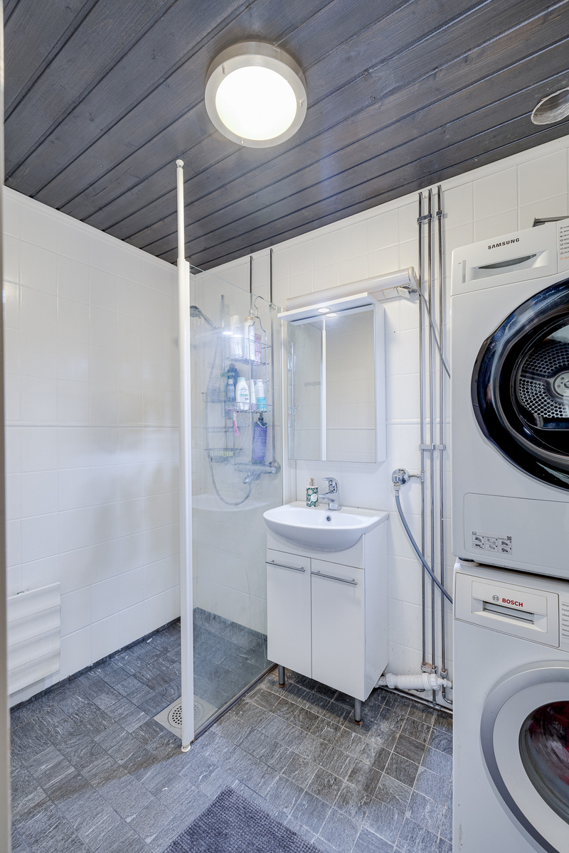 | Pesutilat: | Kylpyhuoneen lattia uusittu ja sen alla on entinen muovimatto, joka toimii vesieristeenä. Varustus: suihku, peilikaappi, kylpyhuonekaapisto Seinät: kaakeli Lattia: laatta |
