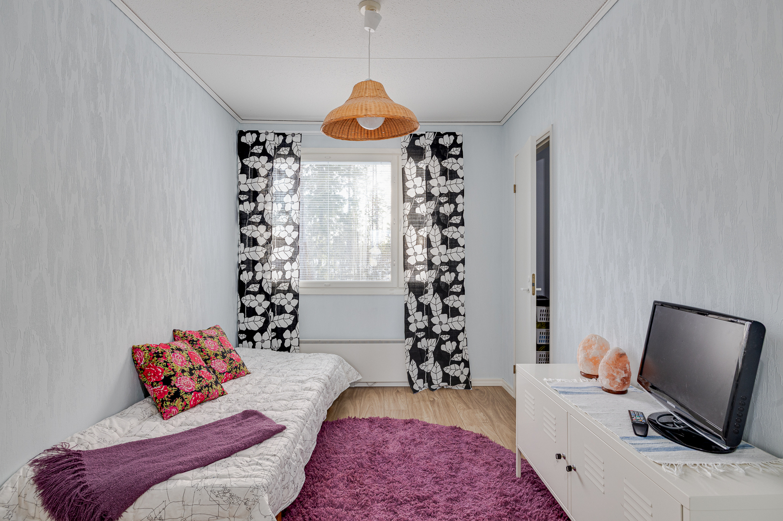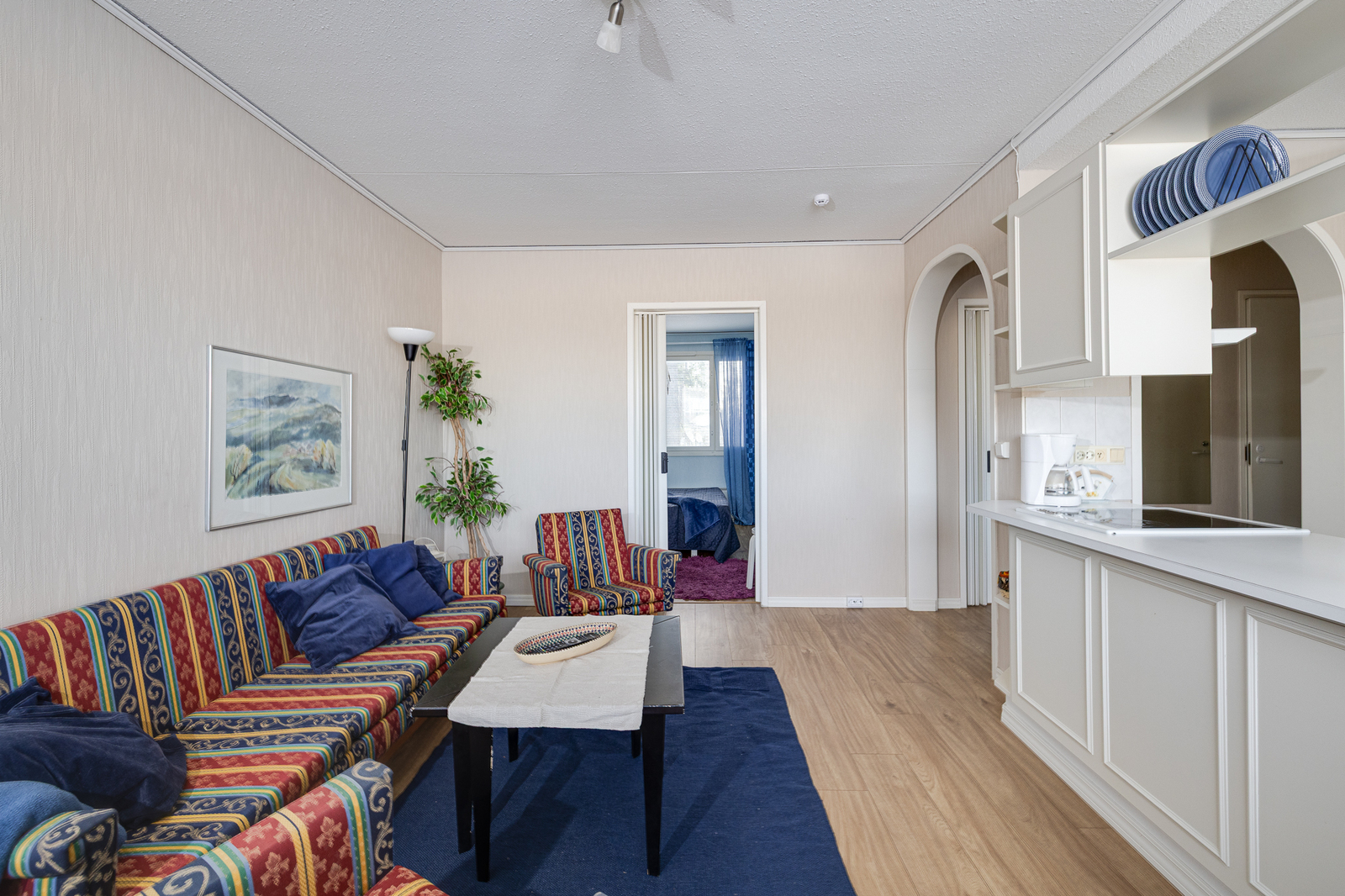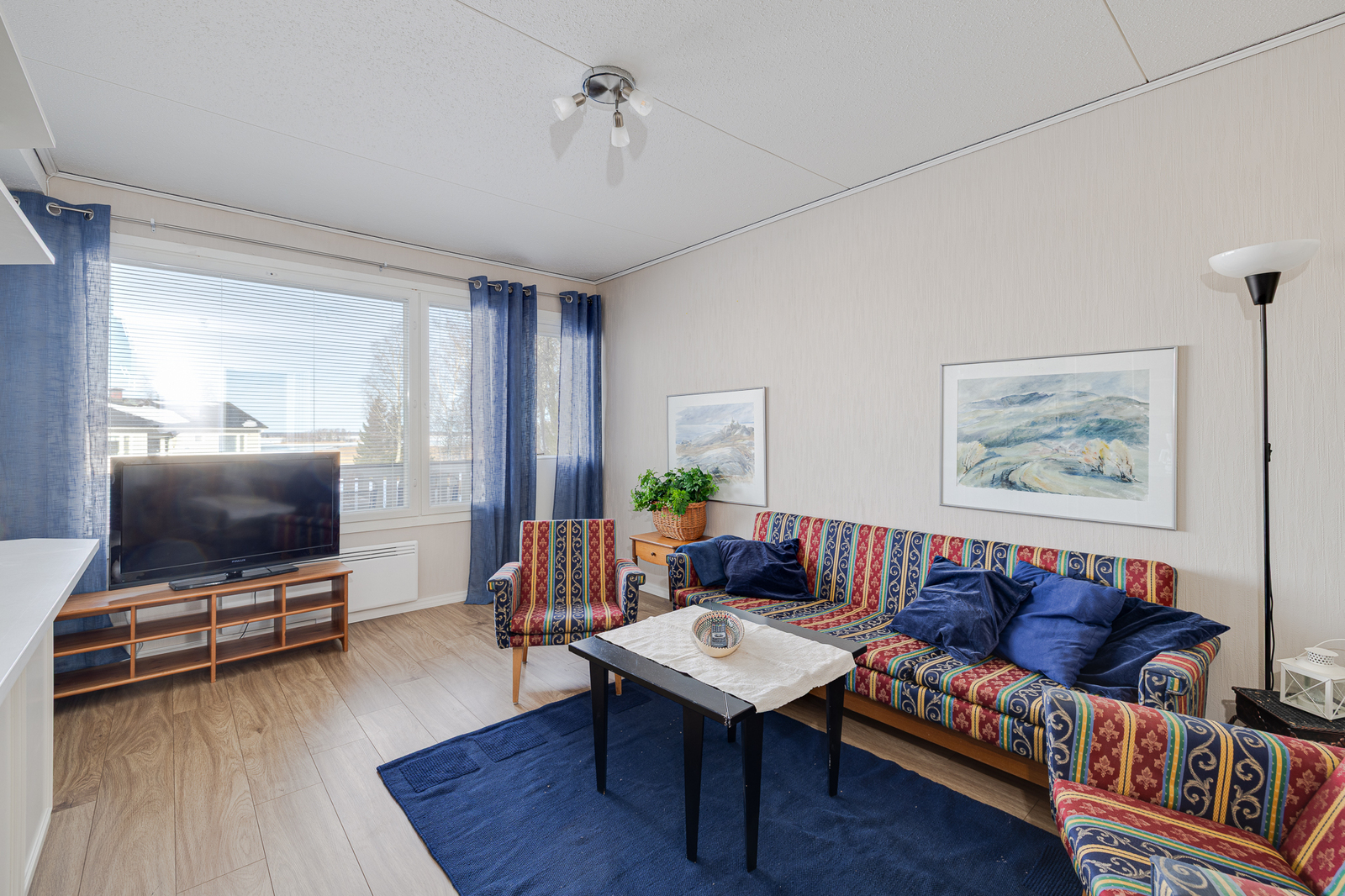 | Olohuone: | Kulku parvekkeelle Seinät: tapetti Lattia: laminaatti |