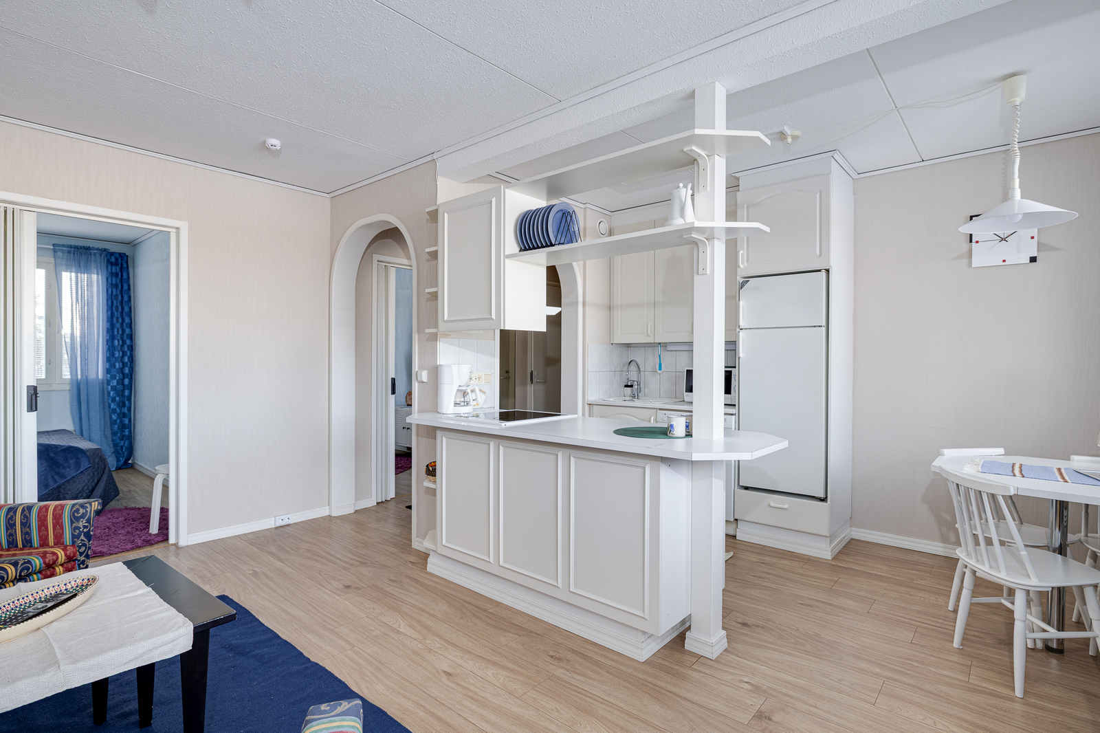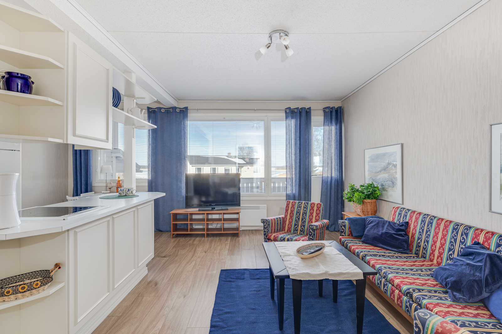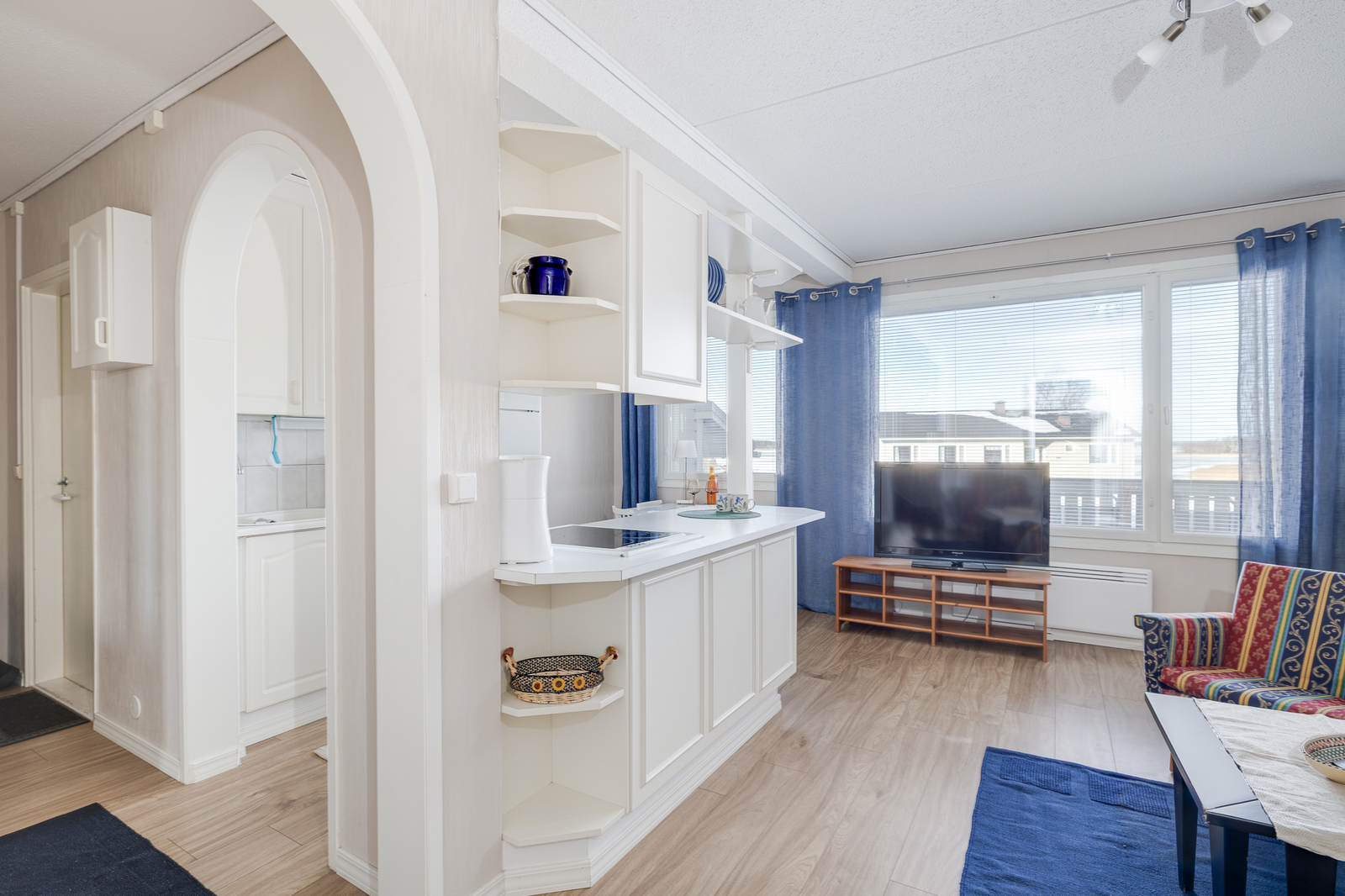 | Olohuone: | Kulku parvekkeelle Seinät: tapetti Lattia: laminaatti |