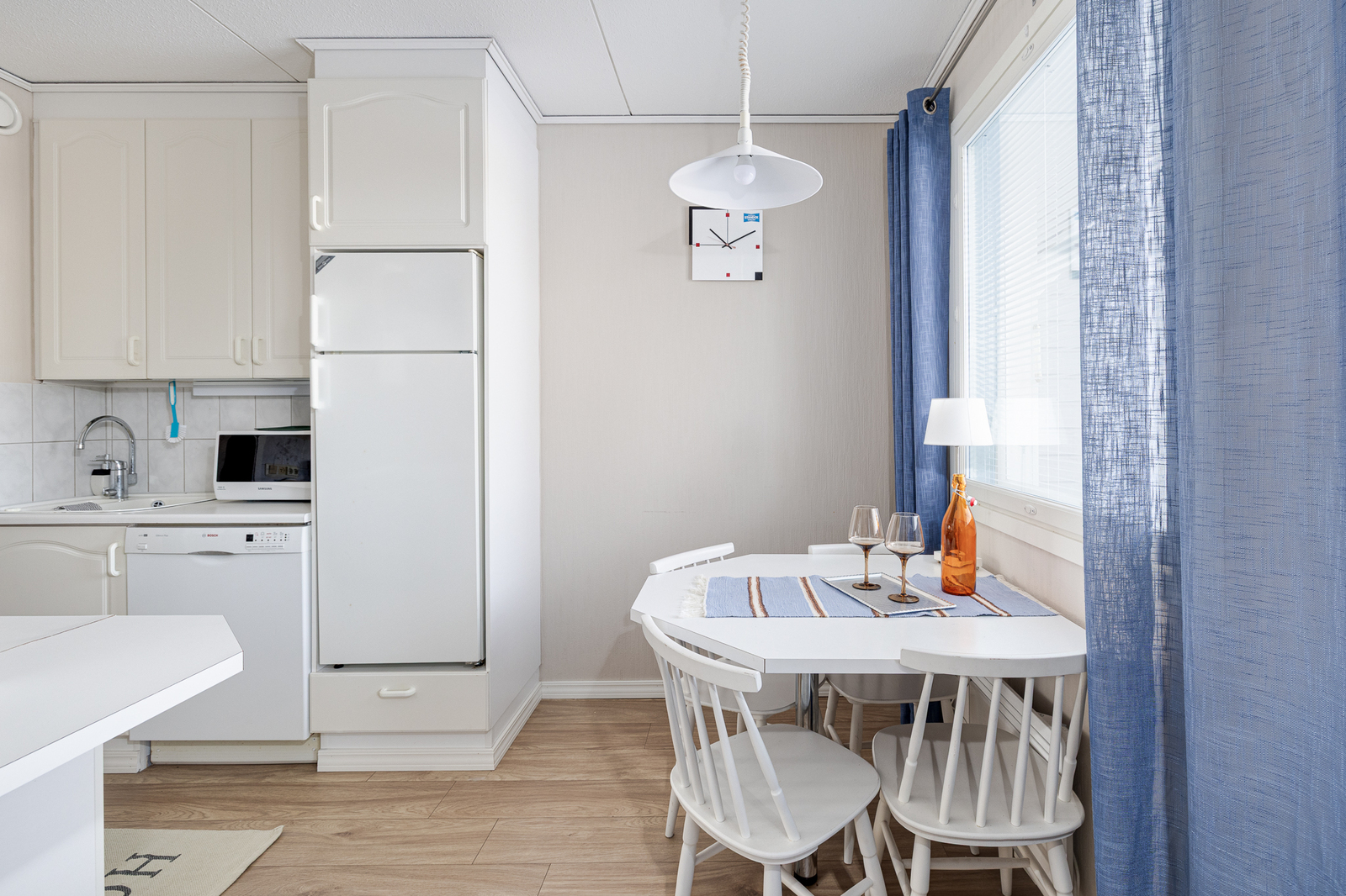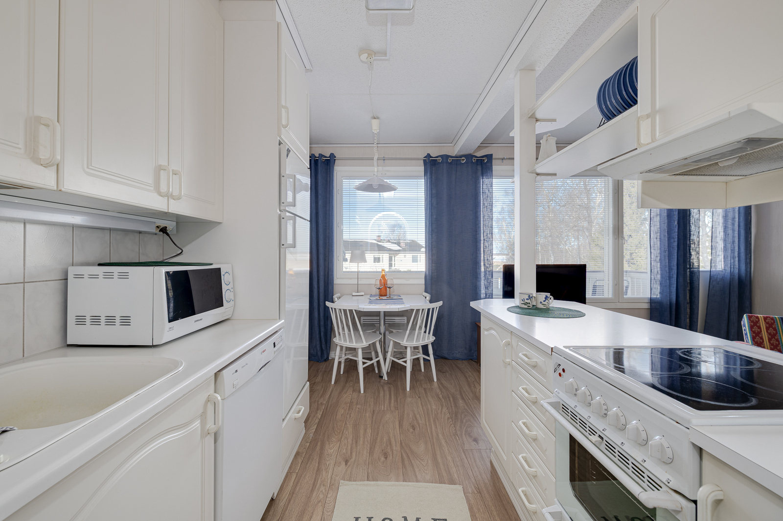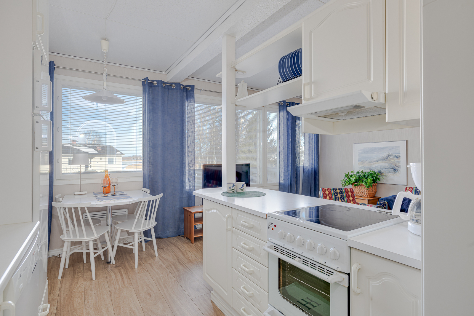 | Keittiö: | Varustus: jääkaappi/pakastin, mikroaaltouuni, astianpesukone, liesituuletin / suodatin. Liesi: keraaminen. Lattia: laminaatti. Seinät: tapetti |