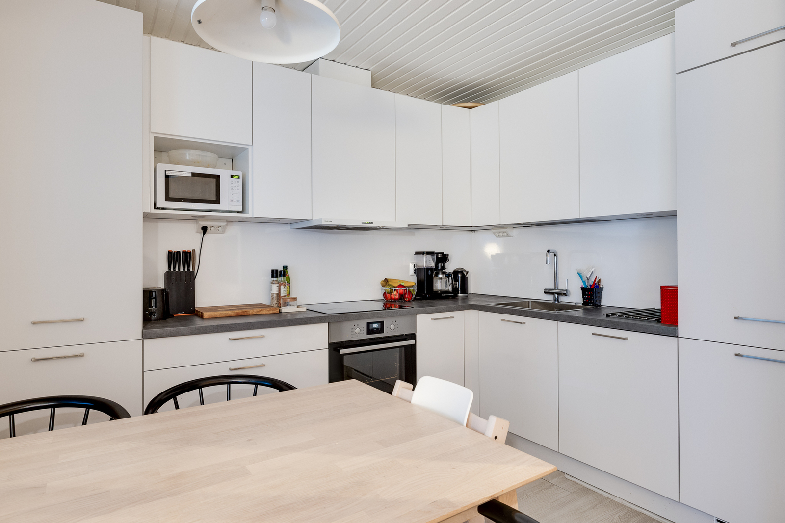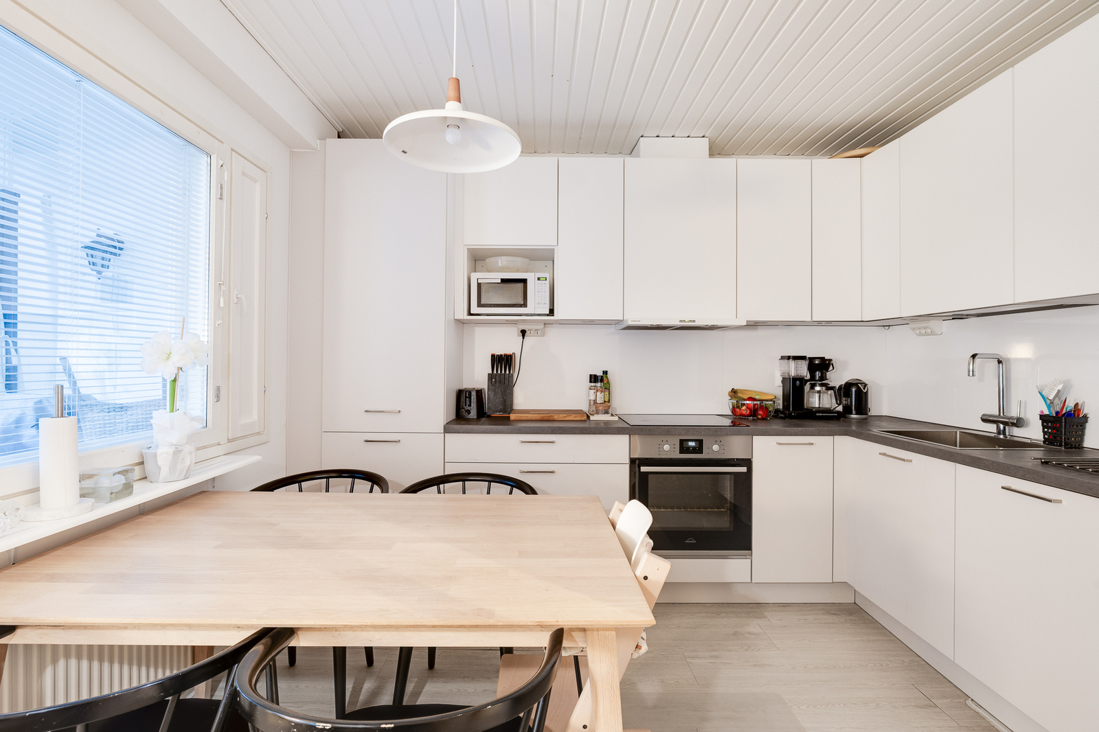 Kök: Utrustning: kylskåp/frys - kombiskåp, spisfläkt, diskmaskin. Arbetsbänk: laminat. Spis: induktionsspis. Golv: vinyl. Väggar: målad