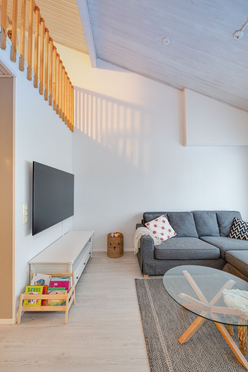Ytmaterial: Golvmaterial: Parkett i vardagsrummet, i sovrummena och i köket. Laminat på loftet.