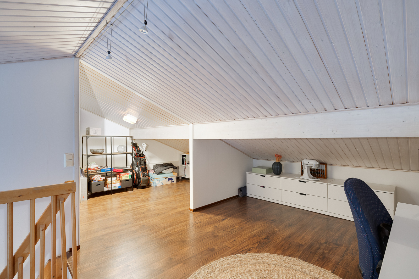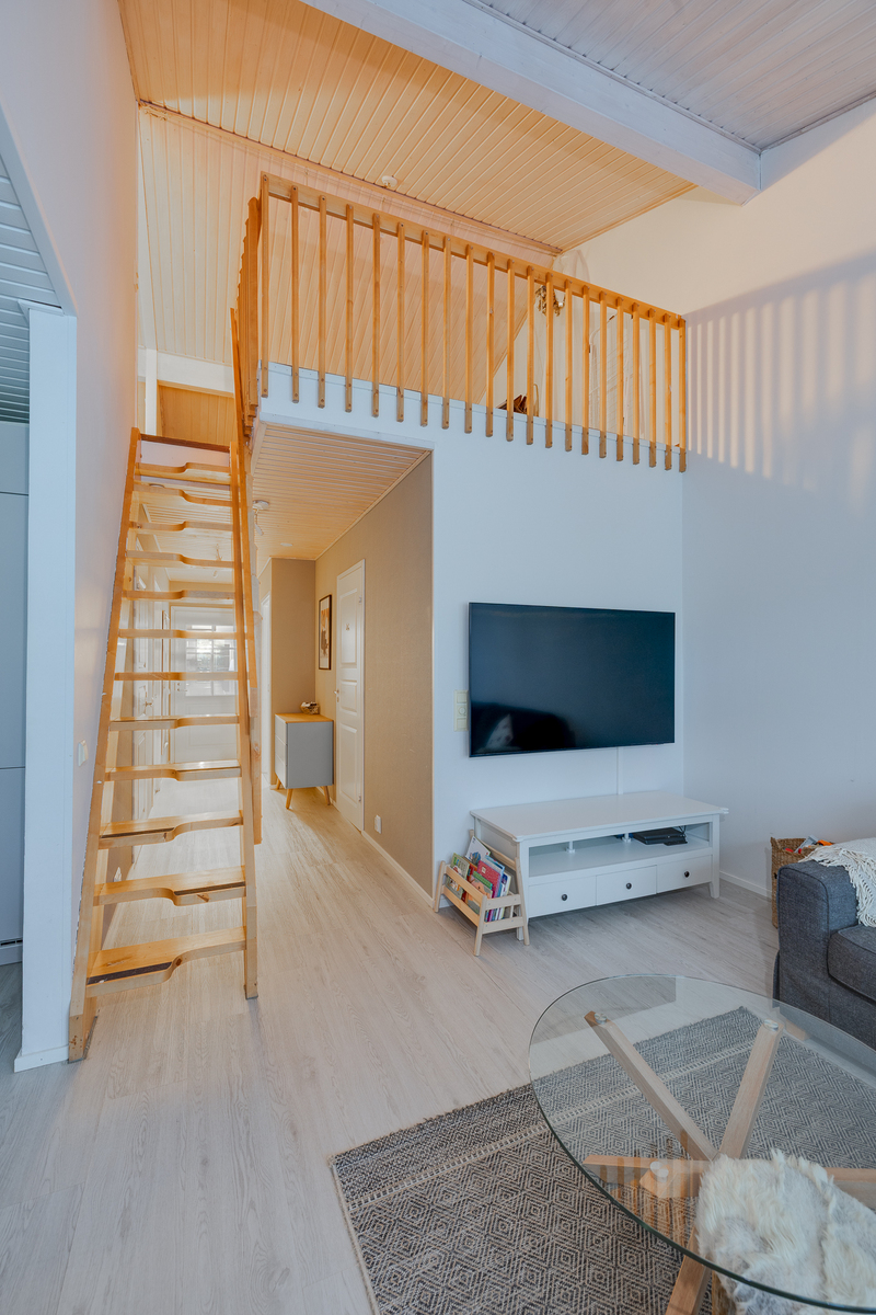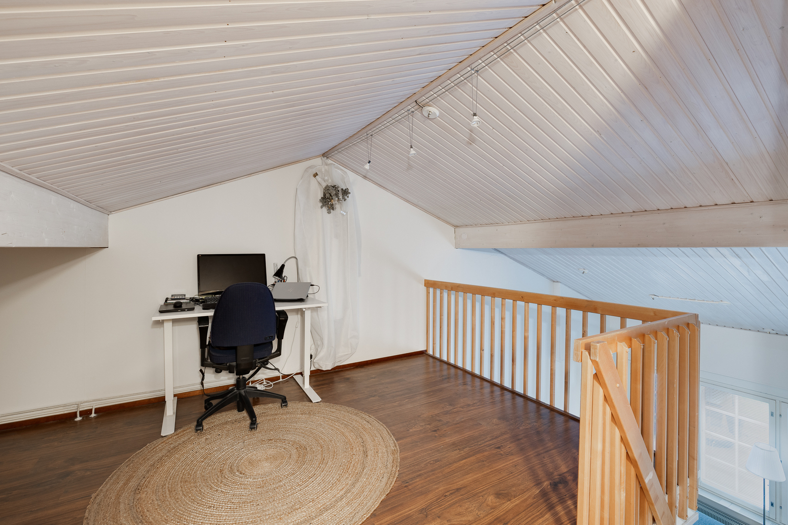 Den här lägenheten är mera än en traditionell trea. Rejält med mångsidigt tilläggsutymme finns på loftet. På loftet finns därtill ett stort, varmt förråd. Vardagsrummets höjd ger rymlig känsla och personlighet till lägenheten. Här finns även ett klädvårdsrum. Både vid entrèn och på gårdssidan finns trevliga glasverandor, som inte är medräknade i bostadsytan. Som pricken på i:et så är bolaget anslutet till fjärrvärme. Läget är också trevligt i början av Gerby och bolagets tomt gränsar till ett grönområde. Biltakplats ingår i priset och även en stolpplats kan fås för en till bil.