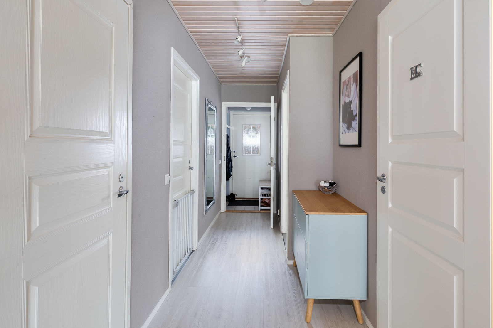Areas grunder: På loftet finns ca 20 m², över 160 cm högt utrymme, därtill ett rymligt förråd. I bostadskvadraterna är inte glasverandan på baksidan eller den kalla verandan på framsidan medräknade.