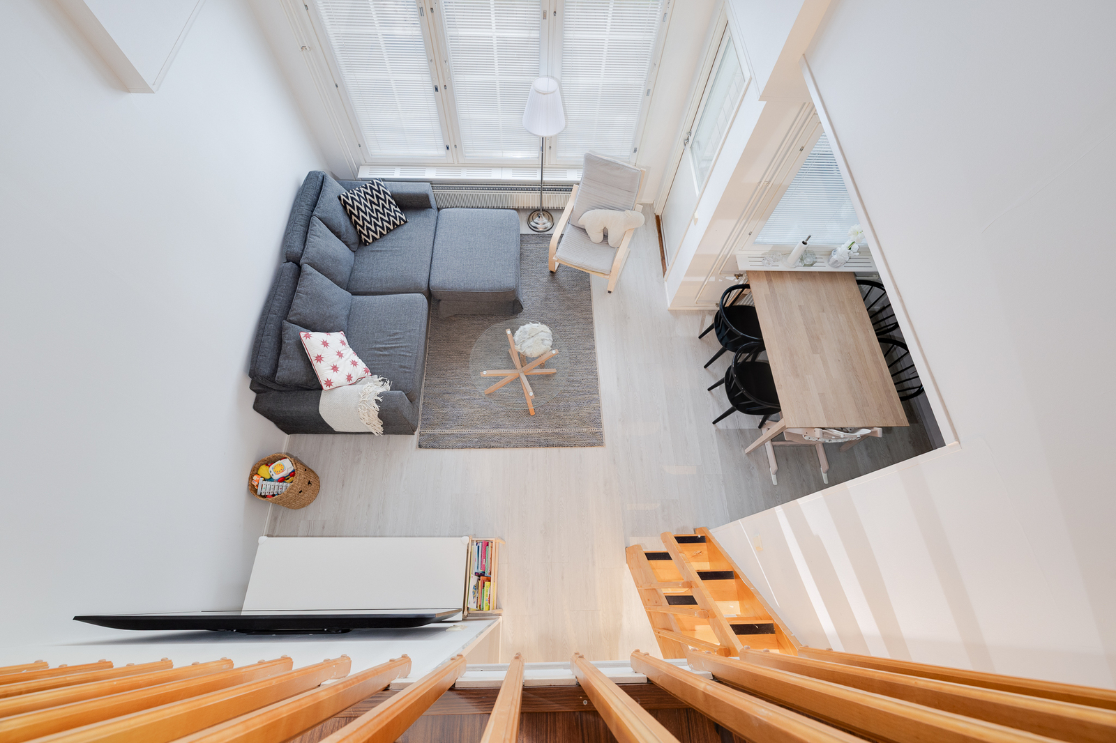 Vardagsrum: Högt utrymme. Anslutet till köket. Utgång till terrassen Väggar: tapet Golv: vinyl